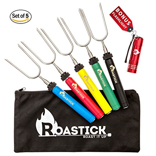 - THE NEWEST ROASTING PACK: Set Of 5 Colorful Marshmallow Roasting Sticks- Rotating & Telescoping Forks. FREE Pouch Travel Bag And Amazing BONUS- Mini LED FLASHLIGHT (With Batteries). PERFECT For Roasting S’mores, Hot Dogs and Vegetables on an Outdoors Cookware, Campfire,Camping, Fire Pit, Bonfire & BBQ.