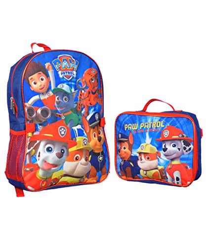 -. Brand : Nickelodeon -. Color : Blue -. Department : boys -. EAN : 0727379055027 -. Feature : Officially licensed Paw Patrol kids back pack with lunch bag / Large size backpack dimensions approx 15"H x 11"W x 5"D and lunch bag dimensions approx 10"H x 8"W x 3"D / Features zipper closure, side pockets, adjustable shoulder straps and straps to attach lunch bag to backpack / Black and red in color / Suitable for childrens ages 3 and up -. Label : Ruz -. Manufacturer : Ruz -. MPN : 55027 -. NumberOfItems : 28 -. PackageQuantity : 1 -. PartNumber : 55027 -. ProductGroup : Apparel -. ProductTypeName : LAGE -. Publisher : Ruz -. Size : 16" -. Studio : Ruz -. Title : Paw Patrol "Doggy Heroes" Backpack with Lunchbox - blue/red, one size -. UPC : 727379055027