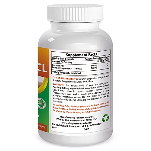 -. Binding : Health and Beauty -. Brand : Best Naturals -. EAN : 0817716012377 -. Feature : Hydrochloric Acid Source / Digestive Support / Supports production of digestive enzyme / Supports efficiency of digestive process / All Best Naturals products are manufactured in accordance with Good Manufacturing Practices (GMP), among the highest standards in the world -- Proudly Made in USA -- Purity & Potency Guaranteed -. IsAdultProduct : 0 -. Label : Best Naturals -. Manufacturer : Best Naturals -. ProductGroup : Health and Beauty -. ProductTypeName : HEALTH_PERSONAL_CARE -. Publisher : Best Naturals -. Studio : Best Naturals -. Title : Best Naturals Betaine HCL 648 mg 250 Capsules -. UPC : 817716012377
