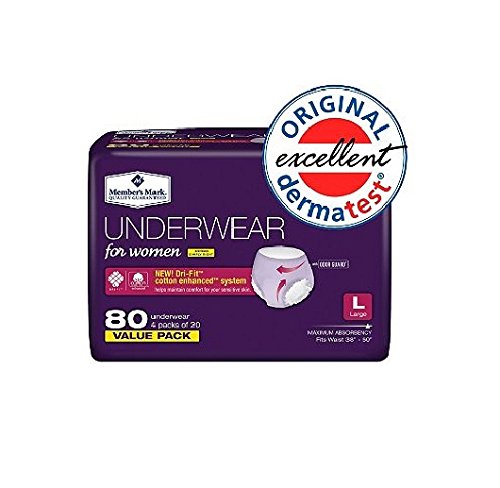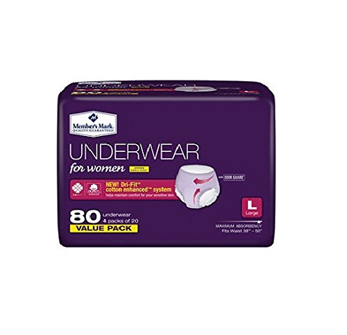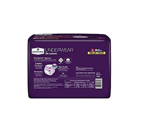 -. Binding : Wireless Phone Accessory -. Brand : Members Mark -. EAN : 0769033077686 -. Feature : Dri-FitTM System provides a new level of protection and skin comfort / Cotton enhancedTM surface helps keep the skin healthy by reducing friction for comfort / Super absorbency core quickly locks up moisture and odor for protection / Cotton enhancedTM surface wicks away moisture to help your skin stay dry and healthy -. IsAdultProduct : 0 -. Label : Member's Mark -. Manufacturer : Member's Mark -. MPN : MEM04011 -. PackageQuantity : 1 -. PartNumber : MEM04011 -. ProductGroup : Health and Beauty -. ProductTypeName : HEALTH_PERSONAL_CARE -. Publisher : Member's Mark -. Studio : Member's Mark -. Title : Member's Mark Protective Underwear for Women, Large (80 ct.) -. UPC : 769033077686