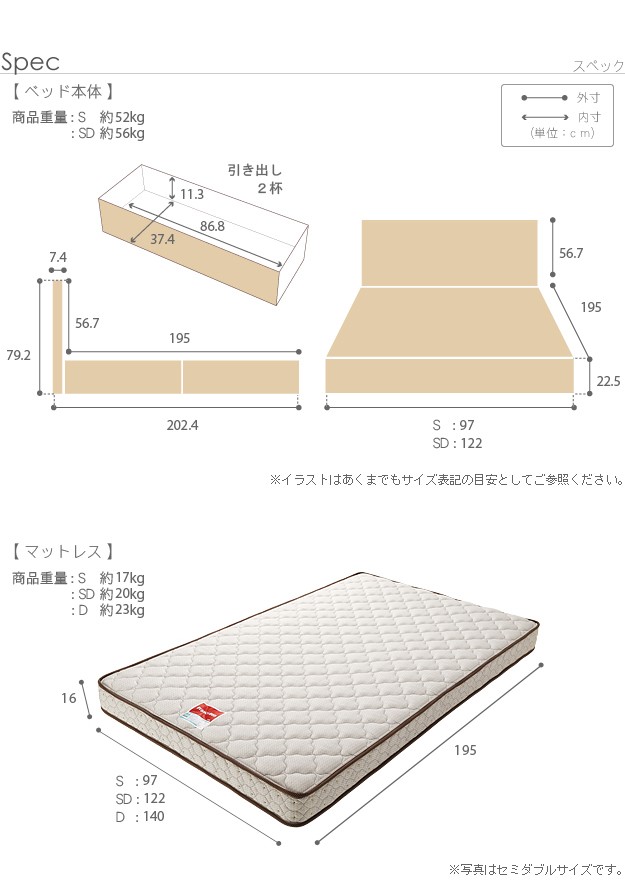 サイズ(cm):[ベッド]幅122x奥行202.4x高さ79.2(床板高さ22.5)cm・約56kg、[マットレス]幅122x奥行195x高さ16cm・約20kg
