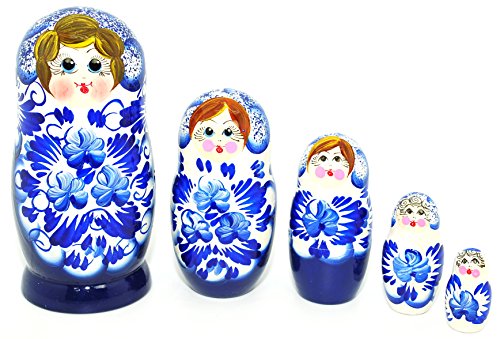 -. Title : Unique Authentic Russian Hand Painted Floral Blue w-Whte Flower Nesting Dolls Set of 5 Pc Matryoshkas