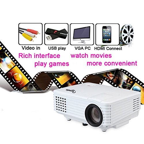 -. Feature : Native Resolution: 800x480; Contrast: 1000:1; Aspect Ratio: 4:3/16:9, not recommended for PPT or business presentation, ideal for home theater movies and video game use. Can provide crystal clear image in dark environment / Image size: 30-120 Inches, Projection distance: 3.5-12.5 Feet. With keystone correction, adjusting the picture trapezoidal distortion. We sest best Projection Distance: 1.5-2M; best Projection Size: 49 to 80 inches, which can make you, obtain best User Experience. / LED lamp, 20,000 hours life. Portable design, easy to take and travel. Great for outdoor movies. Usually, when the projectors works, the fan will make noise to Radiating due to the highly temperature. It will be better that you can have a break after 3 to 4 hours using to avoid overheating. / Support USB flash drive, can play JPEG BMP GIF PNG TIF image,WMA MP3 AV audio,RMVB AVI MP4 video / Portable design, easy to take and travel. Support: Multi-media (Music, Picture, Video, TXT); Connect your PC / Laptop / DVD Player to enjoy videos or movies. Connect PlayStation PS3 PS4 or X-Box via HDMI port to enjoy games on so big screen!The projector has a tv input. you could plug your tv antenna to enjoy tv live shows and programs. Watching movie and football match at home, also applying to courtyard or outside. Halloween, Party, Christmas gift for parents and children.