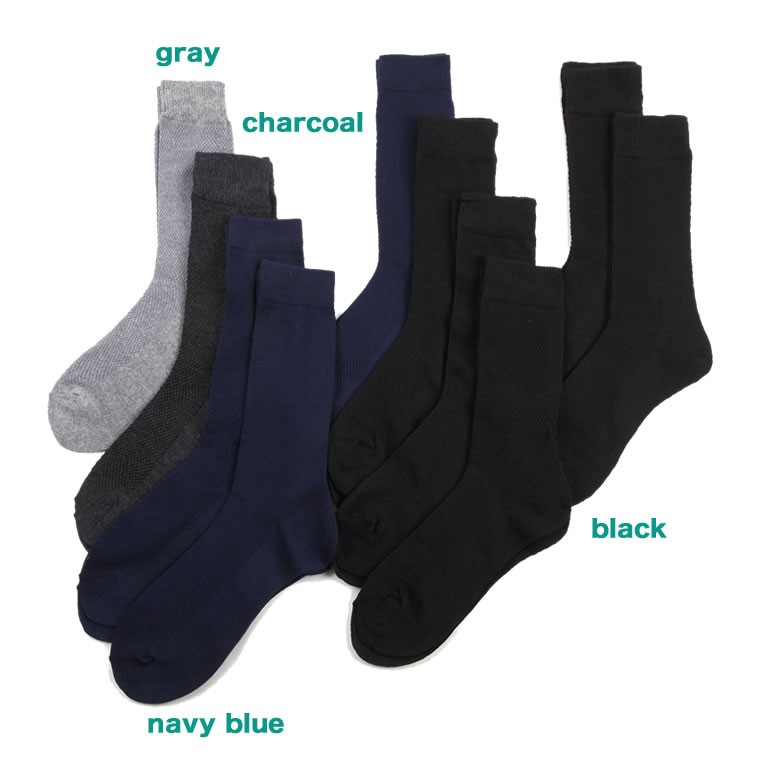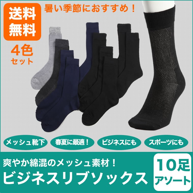 黒・紺・チャコール・グレーのベーシックな4色で展開の10足アソートです。 これからの厚くなる時期に最適な涼しいメッシュ素材。通気性抜群 爽やか薄地の涼感メッシュ 嫌な足元の臭いも抑えます。先丸タイプで足が疲れにくくなっています。シンプルな無地のビジネスリブソックスで、ビジネス、アウトドア、冠婚葬祭、スポーツ、などにも幅広くご利用いただけます。【サイズ】25~26cm 【素材】綿・ポリエステル【カラー】黒・紺・チャコール・グレー