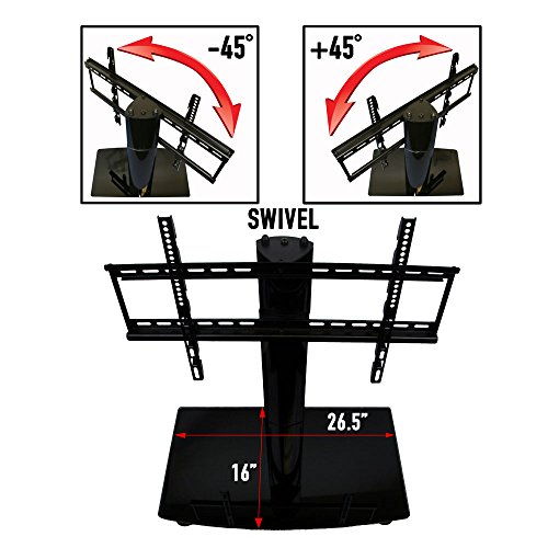 -. Feature : Universal TV stand with adjustable legs will allow for adjustable storage below your stand and also permits the stand to be leveled easily. Works great as a Samsung TV stand, Vizio TV stand, Panasonic TV stand, Sony TV stand, and many more. This adjustable TV stand offers added functionality with height and leveling adjustment to achieve the best look for your A/V equipment. The black 10mm thick tempered safety glass base offers rigid support while maintaining a great look. / Adjustable TV Stand Swivels left or right so achieving the ideal viewing angle has never been easier. Also height adjustable so your TV can be adjusted to your application or allow room for a Soundbar or component below. This way the IR sensor on your TV will never be blocked and your remote control will always function as it should. With 3" if adjustable storage below the stand most components can be easily concealed. Add a shelf to any setting! / This TV stand adds a unique ability to swivel where others cannot. Adustable up to 45 degrees in each direction allows you to utilize the best viewing area by simply pivoting the unit. No need for any tools, adjust it easily whenever you wish. This feature is usually available only on articulating TV wall mounts, conventional TV stands do not offer this feature. / This TV stand measures 27.25" inches tall (from top to bottom of legs) which is not including TV height. The base is 26.5" wide and 16" deep and will accommodate larger components like an amplifier. Maximum TV weight is 80 pounds. This unit weighs in at just 16 pounds. / Universal TV Stand will fit most TVs from 32 to 60 inches in size and weighing up to 80 pounds. To make sure this mount will fit insure your TV's VESA bolt pattern falls between these two sizes : 100x100mm up to 600x400mm. If your TV's VESA pattern falls between these two sizes then it will fit your TV. If you wish to confirm your TVs fitment or need further help, please contact AV Express.