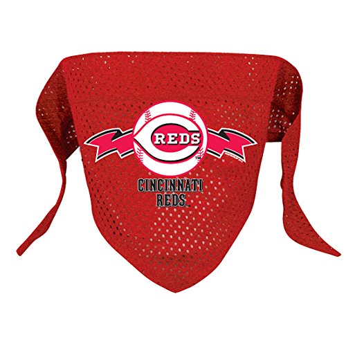 -. Binding : Misc. -. Brand : Hunter -. Color : Team Colors -. Feature : Official team primary logo / Sewn in loop to slide over dog collar / Constructed in micro mesh polyester / Available in Small and Large sizes -. Label : Hunter -. Manufacturer : Hunter -. PackageQuantity : 1 -. ProductGroup : Pet Products -. ProductTypeName : PET_SUPPLIES -. Publisher : Hunter -. Studio : Hunter -. Title : Cincinnati Reds Mesh Dog Bandana