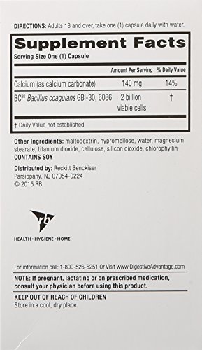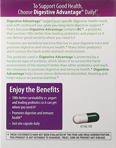 -. Binding : Health and Beauty -. Brand : Digestive Advantage -. EAN : 0020525181671 -. Feature : Probiotics support long-term digestive health with continued use / Bc30 probiotic survives 10x better than other probiotics, including yogurt / Helps provide relief from minor abdominal discomfort, bloating and occasional diarrhea / Daily probiotics formula for both women and men -. Label : Reckitt Benckiser -. Manufacturer : Reckitt Benckiser -. PackageQuantity : 1 -. ProductGroup : Pantry -. ProductTypeName : HEALTH_PERSONAL_CARE -. Publisher : Reckitt Benckiser -. Studio : Reckitt Benckiser -. Title : Digestive Advantage Daily Probiotic Dietary Supplement Capsules, 50 Count -. UPC : 020525181671