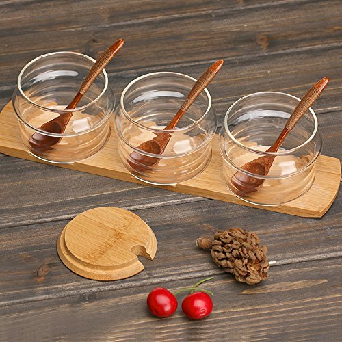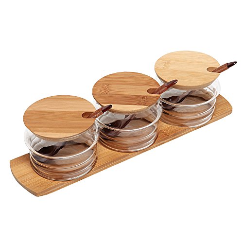 iRSE Glass Tea storage Jar with bamboo tray and wood spoon for condiment pots, spice jars, sugar bowls, tea storage, nuts jar, holding dressings, dipping, salad bar serving, Set of 3