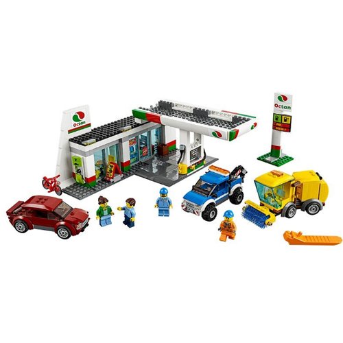 -. Feature : Includes 4 minifigures: a station attendant, mechanic, tow truck driver and a female customer. / Features a 1-story building with 2 different building instructions - either a gas station, with a sign, pumps and kiosk or a service station with lift, mail stand and separate wash station. / Includes building possibilities for 6 different vehicles. / Tow the car to the gas station with the tow truck. / Accessory elements include a hammer, wrench, broom, shovel, 2 bins and a bicycle.
