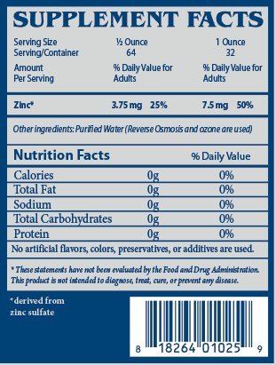 -. Feature : IONIC LIQUID MINERAL - Angstrom size, most cell ready, and most efficient for the body / Zinc Mineral bonded with reverse osmosis water - Minerals are packaged in food safe BPA free plastic bottles. / FLAVOR: Mild Metal flavor - No added ingredients, no preservatives or artificial colors or flavoring. / All Natural - Made in USA- Derived from zinc sulfate- 99.9% Elemental Zinc / NO Expiration Date! Sticker on the bottle is a MANUFACTURING date!
