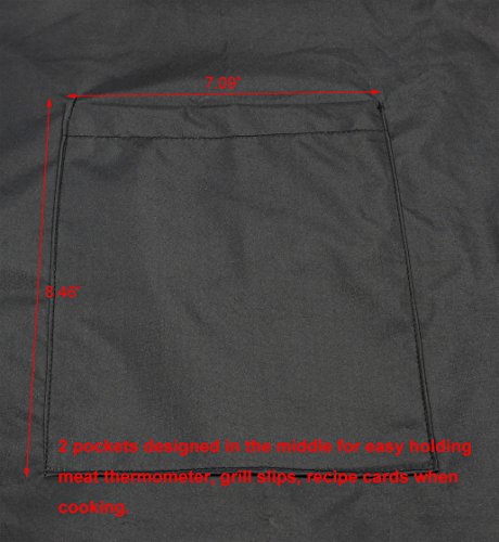 2 pockets designed in the middle for easy holding meat thermometer, groll slips, recipe cards when cooking. This apron waist strap(one side) is 33.46inch(85cm). It is suitable for the user whose waist do not exceed 36 inches.