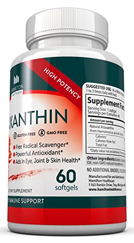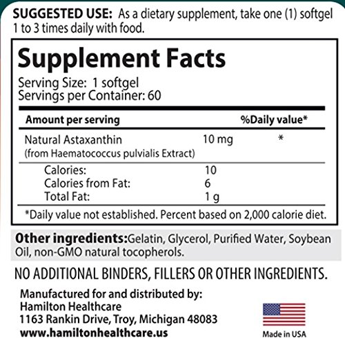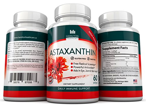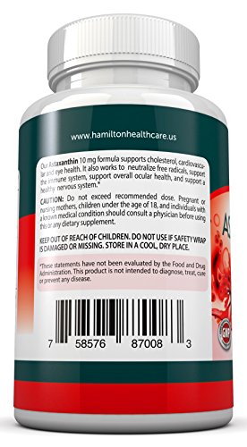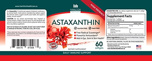 -. Feature : Hamilton Healthcare's Astaxanthin 10 mg formula supports cholesterol, cardiovascular and eye health. It also works to neutralize free radicals, support the immune system, support overall ocular health, and support a healthy nervous system. Our Astaxanthin is GLUTEN FREE and NON GMO / Astaxanthin is one of Earth's most potent anti-inflammatory and antioxidant herbal extracts. It optimizes total body health at the cellular and is shown to support brain, eye, heart, joint, skin, cell & immune health. / Our Astaxanthin is a maximum strength 10 mg Astaxanthin formulation that is specifically formulated to maximize the absorption of Astaxanthin within the body / Astaxanthin is a naturally occurring carotenoid that, because of its unique structure, provides a wide range of antioxidant benefits / MADE IN THE USA in a GMP factory for Hamilton Healthcare. Includes 60 Gluten Free, Non GMO Softgels