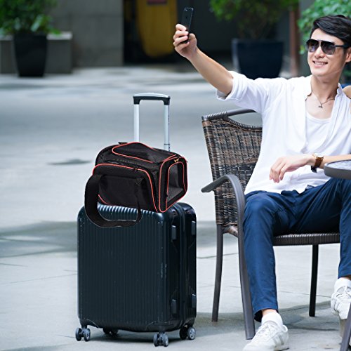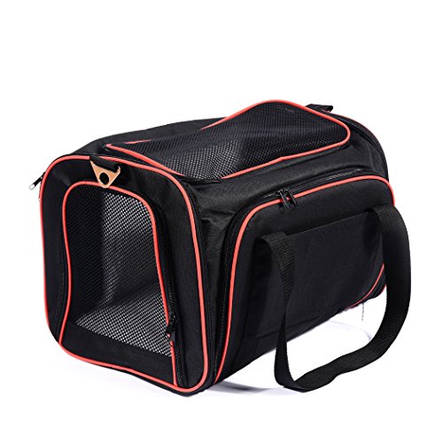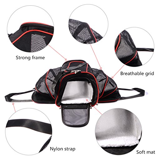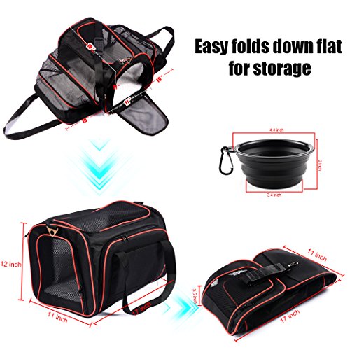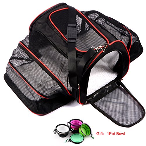 -. Feature : AIRLINE APPROVED PET CARRIER: The size of the cat carrier fit under the front cabin seat of major airline carriers.This is the best match when you bring your love cat or dog to travel. It can make the pet enjoy travelling with you and your family / STABILITY & SOLID: Using high quality 600D Oxford cloth fabric, do not worry dog or cat bite and grasping pet carrier. Perfect for rambunctious animals! There are 4 stainless steel stick to support cat carrier for extra security / TWO SIDES ARE EXPANDABLE: Pet carrier airline approved outward to expand the space, providing a safe and comfortable environment for dogs and cats, and lets pets play around comfortably. Cat carrier bag has multiple mesh sheets to help dissipate heat and air circulation. / EASY TO TRAVEL: Size: 18''*11''*11'', Expandable size : 18''*31''* 11''. It can fold down completely flat for storage. Adjustable and removable shoulder straps for easy carrying. Cat carrier can be portable and diagonal, greatly easing the journey tired, fashion and practical / PET WILL LOVE IT: Recommended max load of 22 lbs (10kg). Please measure your pet's length and heigh and weight. It can meet your pet's needs. A small pocket can place pet food or some small goods.As well as a color random pet bowl as a gift
