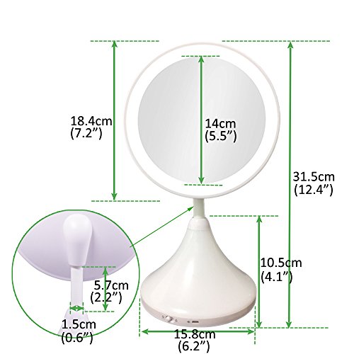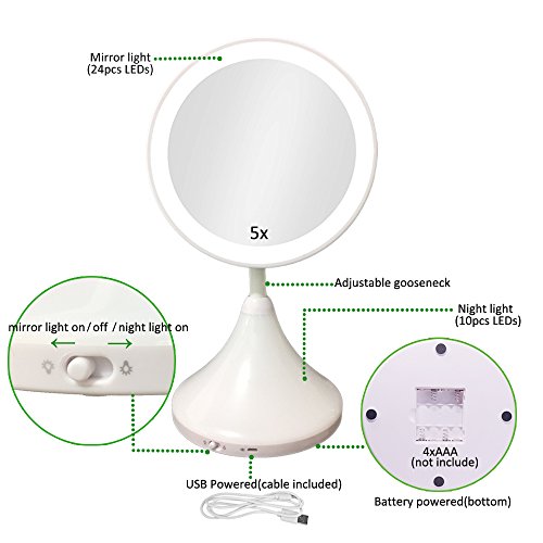 - NIGHT LIGHT FUNCTION at BOTTOM BASE: 24pcs bright LEDs for upper lighted mirror,and 10pcs bright LEDs for bottom night light, not only a magnifying mirror with light,but also a night light.