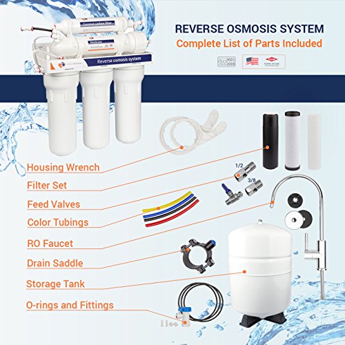 - INCLUDES 5 FILTER CARTRIDGES, RO faucet, Storage Tank, Housing Wrench, Feed Valve, tubings, Drain Saddle, Spare O-rings and Fittings