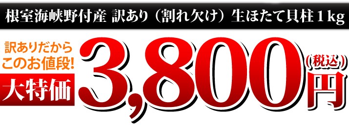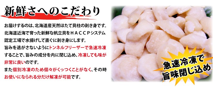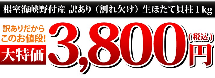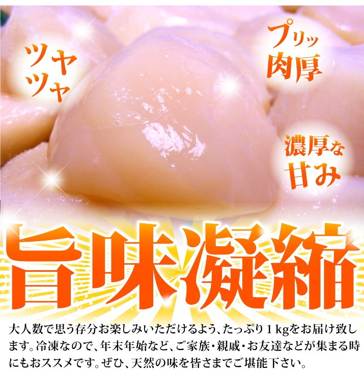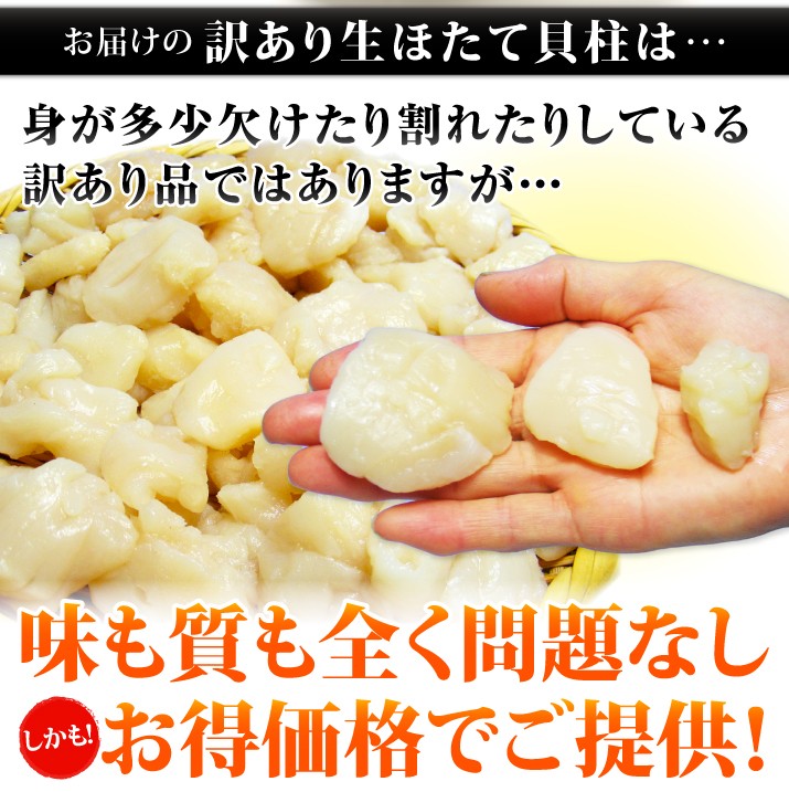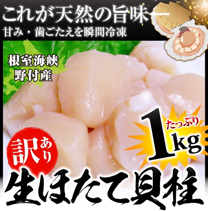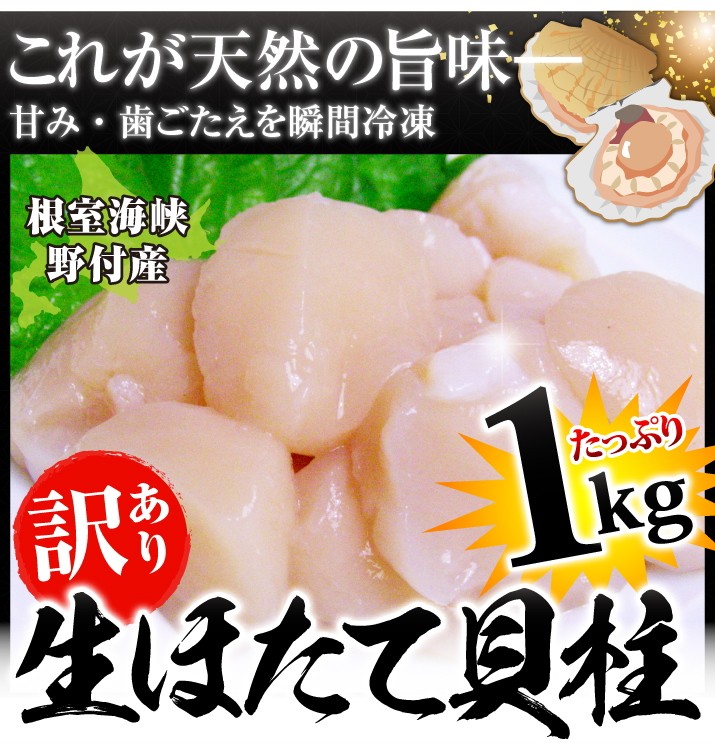 | 商品内容 | 北海道産 天然ほたて貝柱刺身用1kg(割れ、欠けを含む) 生産地:北海道根室海峡野付 |