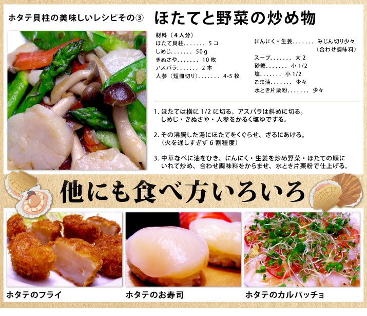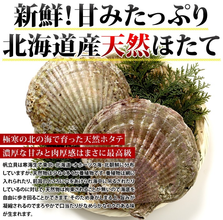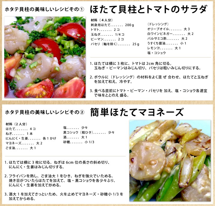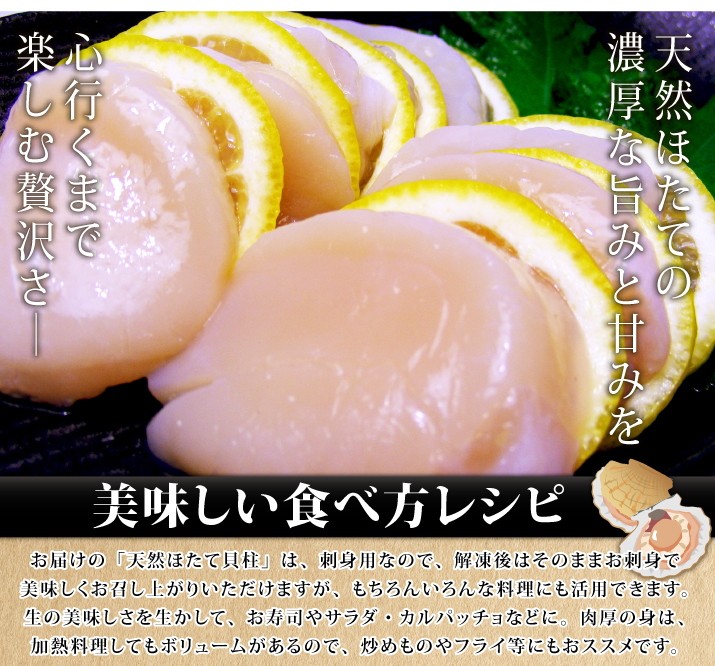 | 保存方法 | 要冷凍、-18度以下で保存。 生食用なので解凍後そのまま生でお召し上がりください。お刺身用の他、天ぷら、フライ、バター焼き 、その他いろいろなお料理にご使用ください。 ※天然貝のため漁獲方法が八尺網(熊手の様な大きな漁具)を使用しているため砂、殻等の付着、混入につきましては万全を期しておりますが、稀に付着、混入している事がありましたら、解凍後薄い塩すいにて水洗いしてもらえればおいしく召し上がれます。 |