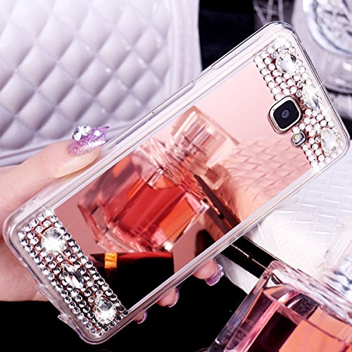 Galaxy J7 Case, J7 Mirror Case, PHEZEN Luxury Crystal Rhinestone Electroplate Plating Frame Soft TPU Rubber Bumper Case Bling Diamond Glitter Makeup Mirror Back Case for Samsung Galaxy J7, Rose Gold