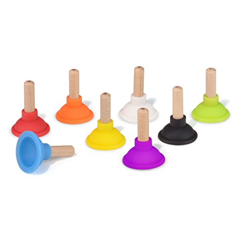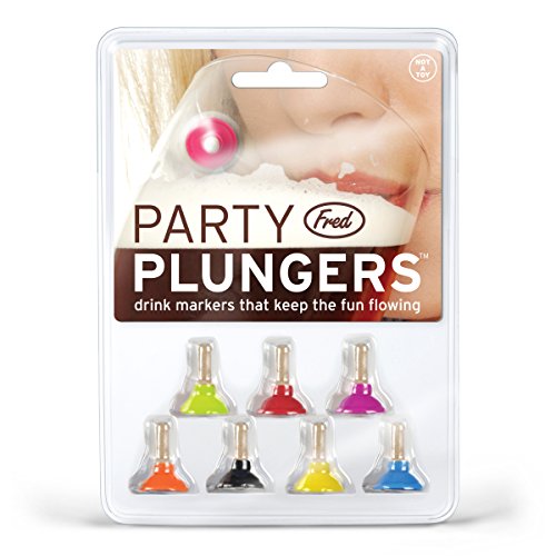 Studio : Fred Publisher : Fred Binding : Kitchen Product Description Now, which glass is yours? Unclog your mind and let these colorful Party Plungers help you remember. Each is a perfect replica of the real thing, complete with wooden handle and functional suction cup head that sticks to any smooth surface. You'll never be stuck wondering again! Includes 8 color-coded plungers. 0