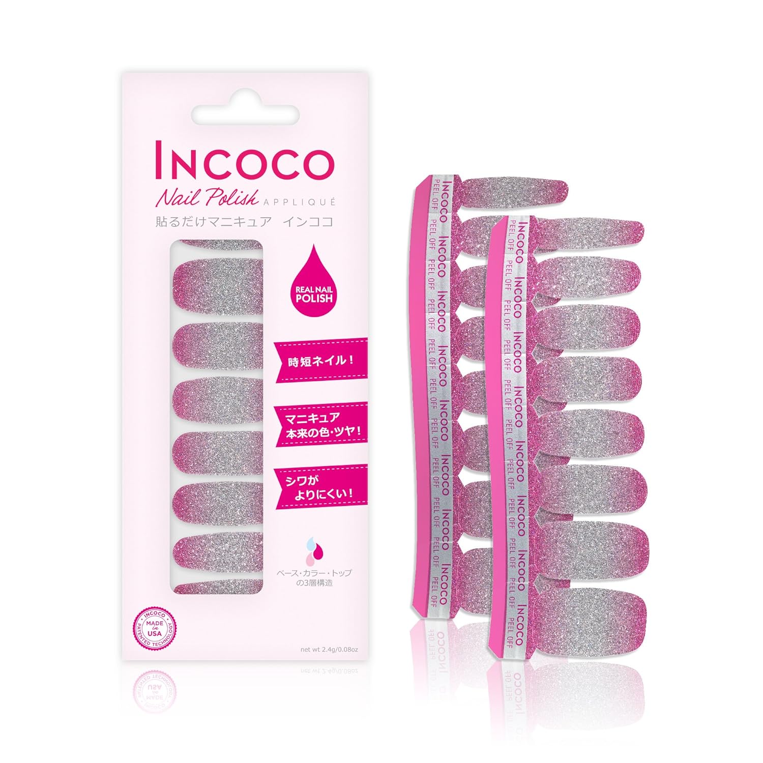 アメリカ生まれの貼るだけマニキュア 「インココ・ネイル・ポリッシュ・アップリケ」(Incoco)はマニキュア成分でできたシートタイプのマニキュアです。乾かす時間不要、塗りムラ知らず、且つマニキュアならではの発色やツヤを楽しめます。インココでまったく新しいマニキュア体験をしてみませんか!ピンクとシルバーのラメグラデでゴージャス感を演出。年代を問わず人気のデザイン。