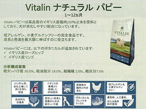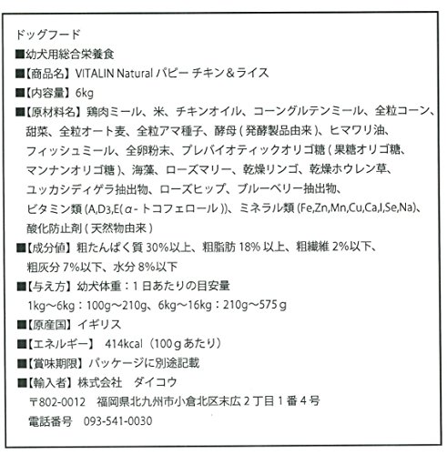 原材料:鶏肉ミール、米、チキンオイル、コーングルテンミール、全粒コーン、甜菜、全麦オート麦、全粒アマ種子、酵母(発酵製品由来)、ヒマワリ油、フィッシュミール、全卵粉末、プレバイオティックオリゴ糖(果糖オリゴ糖、マンナンオリゴ糖)、海草、ローズマリー、乾燥リンゴ、乾燥ホウレン草、ユッカシディゲラ抽出物、ローズヒップ、ブルーベリー抽出物、ビタミン類(A,D3,E(α-トコフェロール))、ミネラル類(Fe,Zn,Mn,Cu,Ca,l,Se,Na)、酸化防止剤(天然物由来)