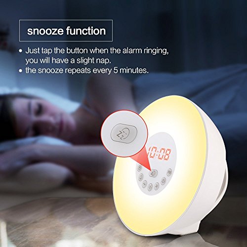 NATURAL SOUNDS & FM RADIO: This wake up light is equiped with 6 natural sounds and FM radio function. Just choose one of them as your wake up voice, making you feel easier to get up from the wonderful voice.