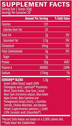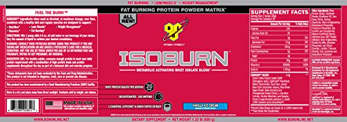 Isoburn Vanilla 1.32 lb Powder2-in-1 Product - consisting of 100% Whey Isolate Protein Powder and stimulant free fat-burning ingredients, allowing the use of ISOBURN day or night to support your metabolism while promoting lean muscle mass.The science of weight loss doesnt have to be complicated. Put in the hard work, make smart nutritional choices and you can turn your body into a fat-burning machine. BSN Pros have developed the all-new ISOBURN to help support your fat-burning potential while promoting toned muscle. Each serving provides 20 grams of 100% Whey Protein Isolate along with a powerful blend of Green Coffee Extract, L-Carnitine, and LeptiCore. Because the formula is decaffeinated, you can mix up a great tasting shake any time of the day or night.