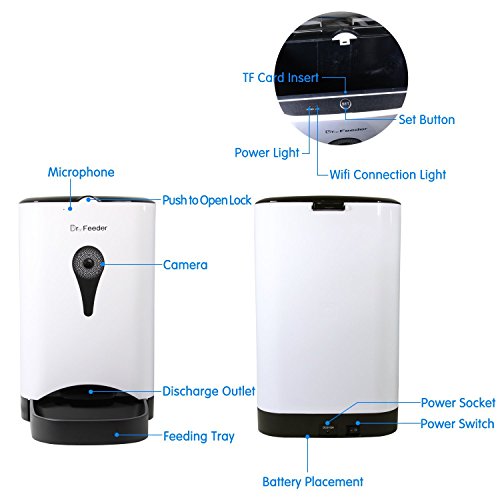 Studio : Dr.Feeder Publisher : Dr.Feeder Binding : Misc. Product Description Your pet likes to be fed on a schedule, but that schedule doesn't always match your to-do list. The feeder uses an innovative conveyor that dispenses dry food, giving you the best way to manage your pet's feeding routine. Smart pet feeder is a device which will automatically or manually feed your pet alone at home with an APP on your IOS or Android devices. Don't worry about pet been hungry when you aren't at home. Now you can see and talk to your pet at any time or any place with 130° wide-angle webcam and microphone.