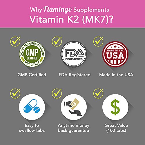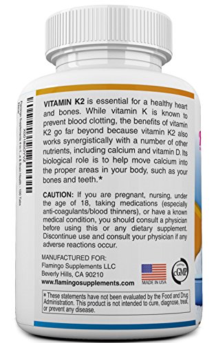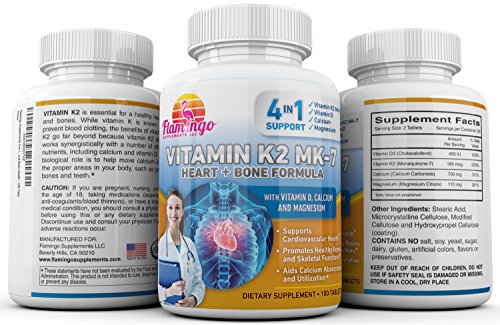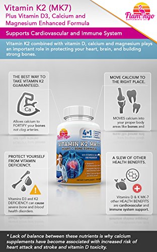-. Binding : Health and Beauty -. Brand : Flamingo Supplements -. EAN : 0694263712376 -. Feature : THE BEST WAY TO TAKE VITAMIN K2 GUARANTEED. Our vitamin K2 MK7 formula is specially developed to provide the correct balance between K2 and vitamin D3, calcium and magnesium. This will allow calcium to fortify your bones not clog arteries. Plus, the lack of balance between these nutrients is why calcium and vitamin D have become associated with increased risk of heart attack and stroke. / PROTECT YOURSELF FROM VITAMIN DEFICIENCY: Vitamins D3 and K2 are vital for the normal function of the human body, and their deficiency can cause severe bone and blood health disorders, especially in children and the elderly. Each serving contains 400 IU OF D3 & 180 mcg of K2 - enough to fully cover your recommended daily intake! / MOVE CALCIUM TO THE RIGHT PLACE. The role of vitamin K2 is to help move calcium into the proper areas in your body, such as your bones and teeth. It also helps remove calcium from areas like your arteries and soft tissues / A SLEW OF OTHER HEALTH BENEFITS: Besides bone health, vitamins D & K MK-7 have many other health benefits, such as cardiovascular and immune system support. It has been found that a Vitamin D rich diet can even reduce mortality rate in elders. As always, consult your doctor to gain more information on how these vitamins can help you. / ANYTIME MONEY BACK GUARANTEE: At Flamingo Supplements we have absolute faith in our nutritional supplements. We use them daily ourselves, after all! If, however, you are in any way dissatisfied with our products, simply contact us and we'll offer you a full refund. Our customers' satisfaction is paramount! -. IsAdultProduct : 0 -. Label : RO -. Manufacturer : RO -. MPN : 111734 -. PackageQuantity : 1 -. PartNumber : 111734 -. ProductGroup : Health and Beauty -. ProductTypeName : HEALTH_PERSONAL_CARE -. Publisher : RO -. Studio : RO -. Title : Flamingo Supplements- Vitamin K2 (MK7) Plus Vitamin D3, Calcium and Magnesium Enhanced Formula - Supports Cardiovascular and Immune System - 100 Tabs -. UPC : 694263712376