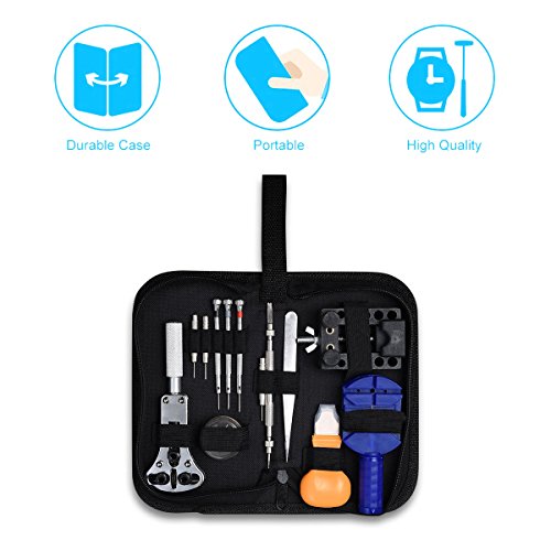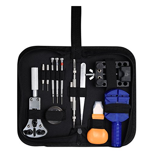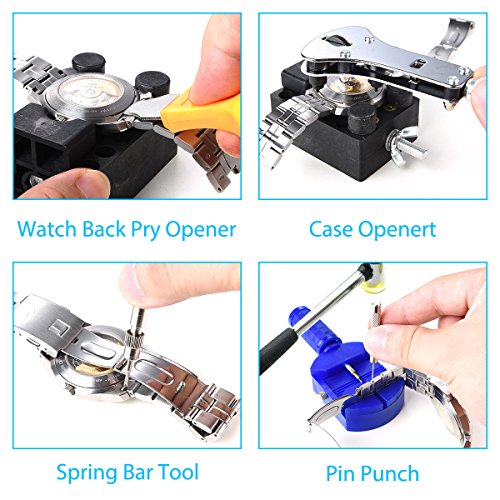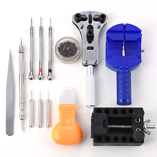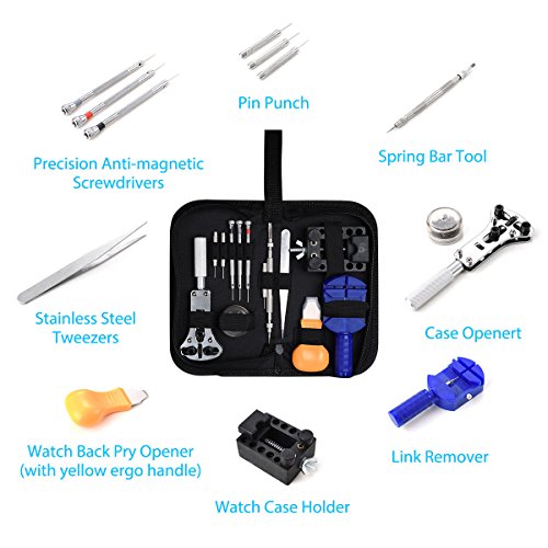 - 13 Pcs tool includes: 1 x Watch case holder, 1xPin Case, 1xLink remover ,3xPin punches, 3x Screwdrivers, 1x Spring bar removal tool, 1x Tweezers, 1x Watch back pry opener, 1x Case opener.