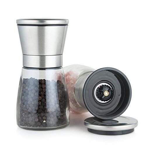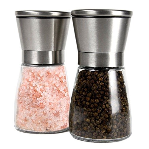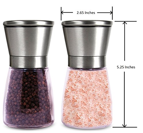 ELEGANT DESIGN: The top of the bottle is made of brushed stainless steel. The body is made of high quality clear glass. It is easy to see through and you will know when to refill. The set comes with a stainless steel stand that allows you to display and store your grinder sets. (Salt &pepper are not included)