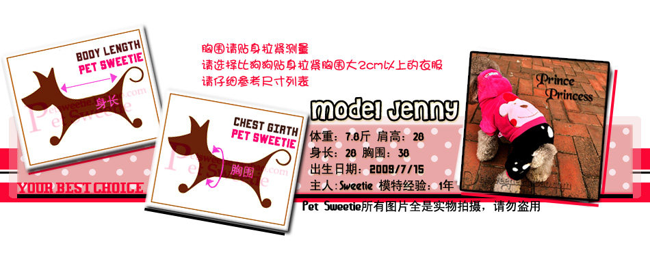 模特Jenny,身长28cm,胸围38cm,体重7.8斤。穿S号。身长偏短