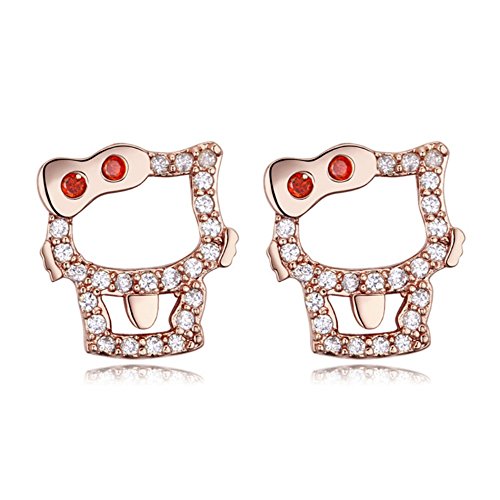Unique and contemporary Rose gold-toned and white stone-studded Hello Kitty stud earrings finished in polished Rhodium, has a kitten shape white studded crystals with red stone bow. Secure with a post and back closure.