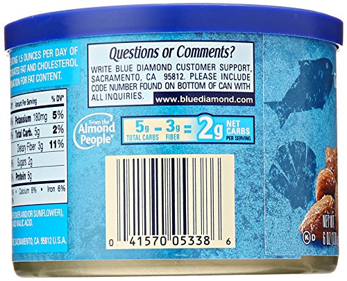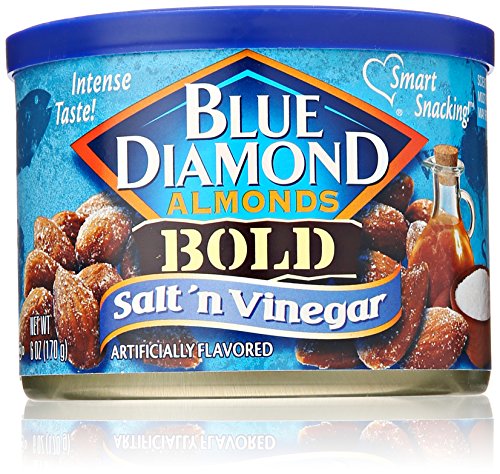 -. Binding : Grocery -. Brand : Blue Diamond Almonds -. EAN : 0041570053386 -. Feature : 6-Ounce tins / Sweetness of almonds mixed with the tart vinegar tang and a dash of salt / Heart healthy -. Label : Blue Diamond Growers -. Manufacturer : Blue Diamond Growers -. PackageQuantity : 1 -. ProductGroup : Pantry -. ProductTypeName : GROCERY -. Publisher : Blue Diamond Growers -. Size : 6 Ounces -. Studio : Blue Diamond Growers -. Title : Blue Diamond Almonds, Salt and Vinegar, Bold, 6 Ounce -. UPC : 041570053386