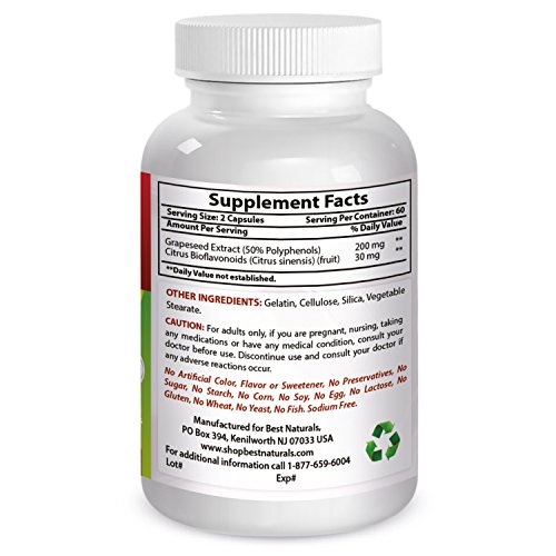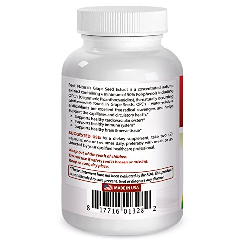 Best Naturals Grape Seed Extract is a highly concentrated natural extract containing a minimum of 50% Polyphenols, including OPC's (Oligomeric Proanthocyanidins), the beneficial antioxidant compounds found in Grape Seeds. Grape Seed Extract and OPC's have been the subject of numerous scientific studies demonstrating their efficacy in the support of cardiovascular health and immune system balance. In addition, non-clinical studies have shown that Grape Seed Extract may protect healthy brain and nerve tissues.