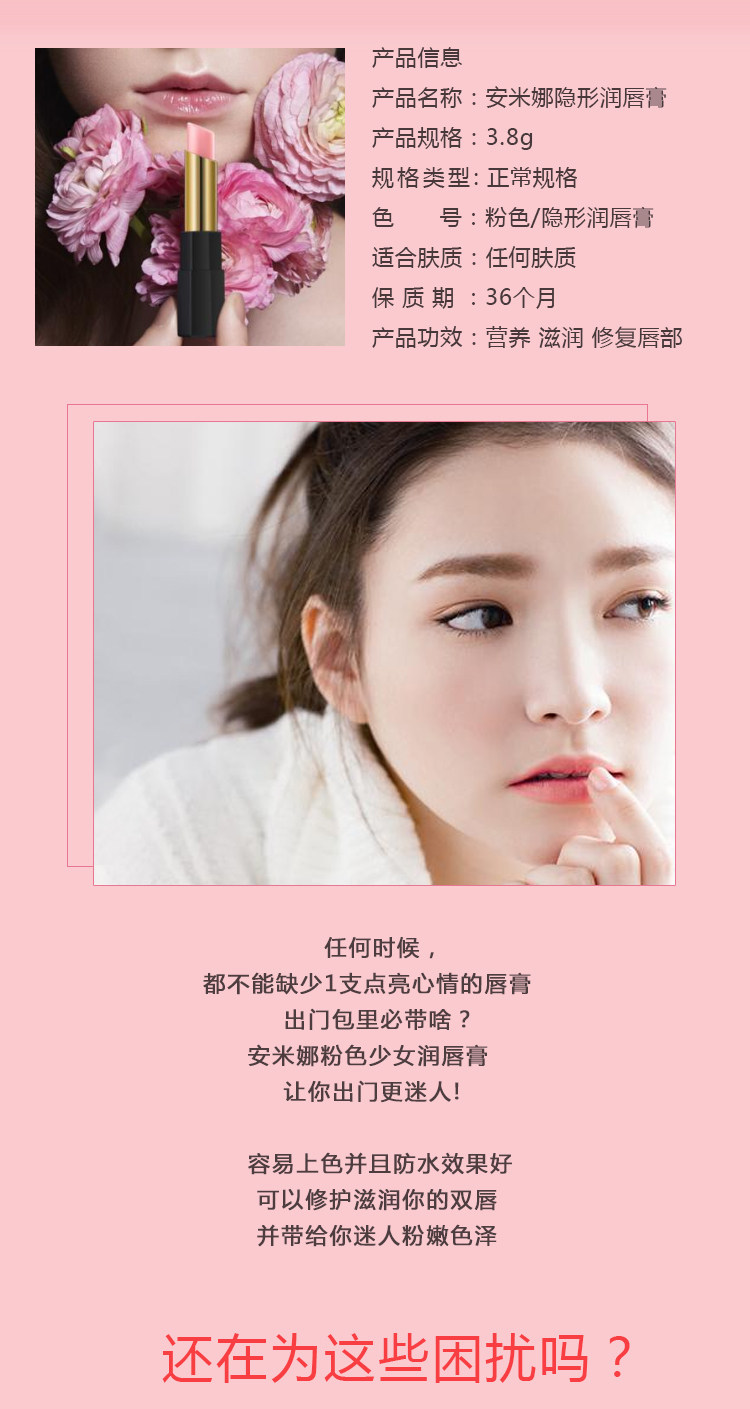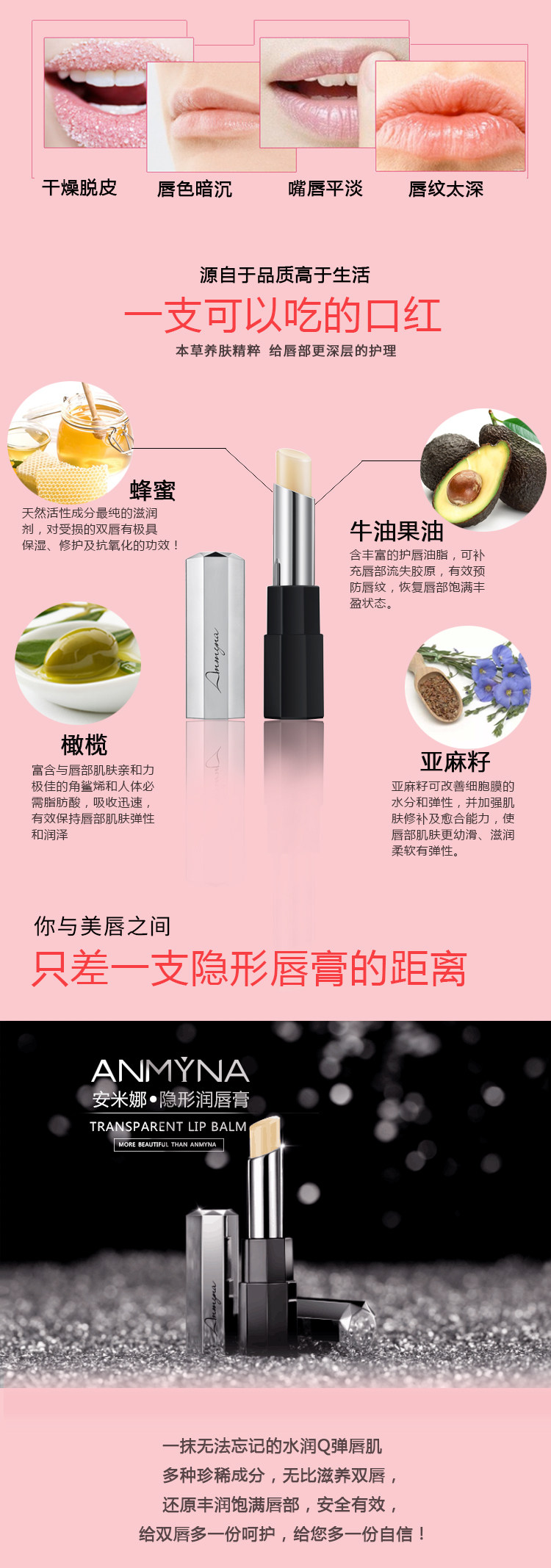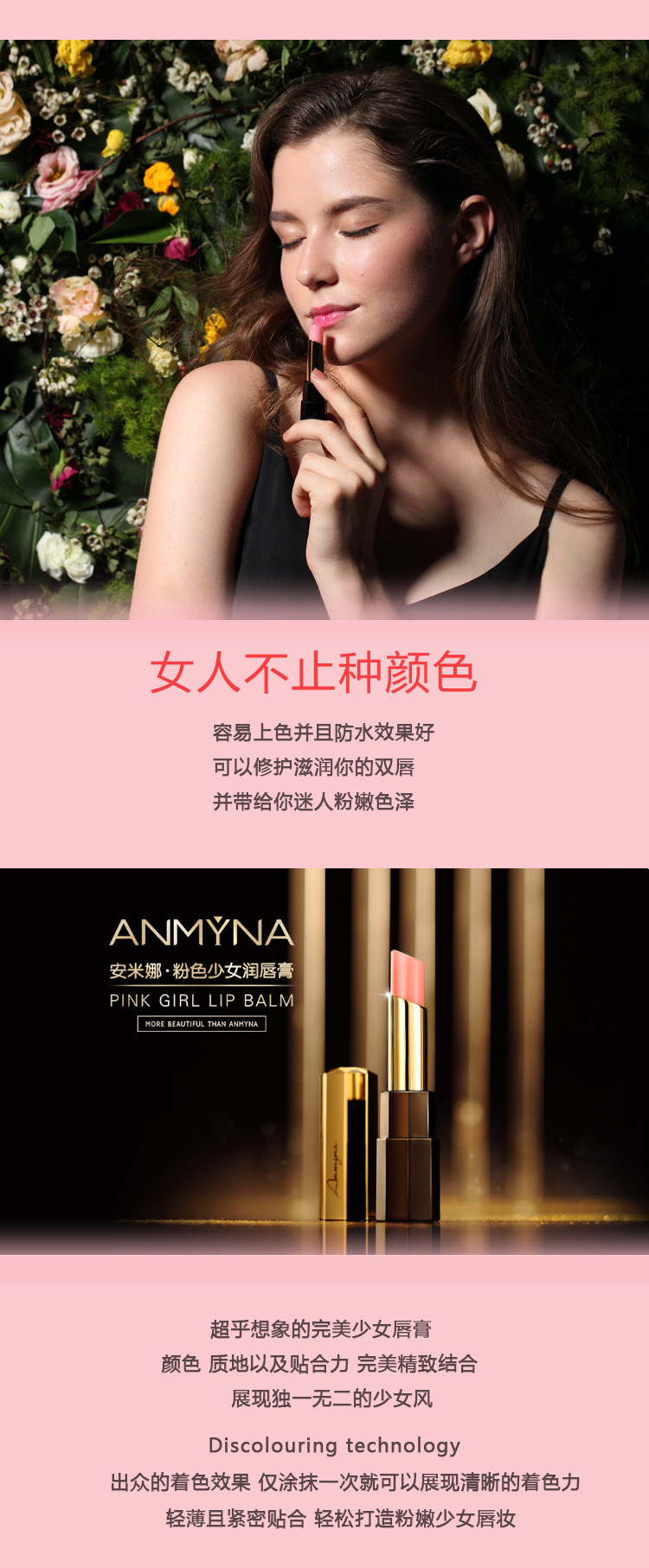 The ANMYNA Pink Girl Lip Balm helps to ease fine lines and lip cracks by moistening up your lip when applied.
