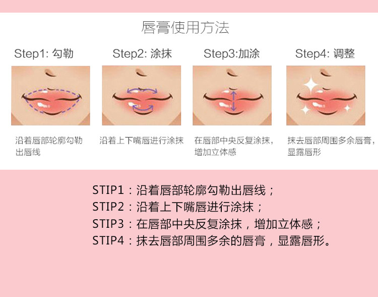 Open the cap and reveal half a centimetre of the balm. Apply by drawing the shape of your lips and spread excess balm over areas near the mouth that also become dry or cracked by making the lips-hiding expression.