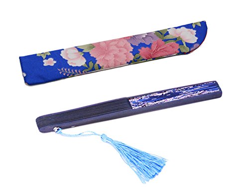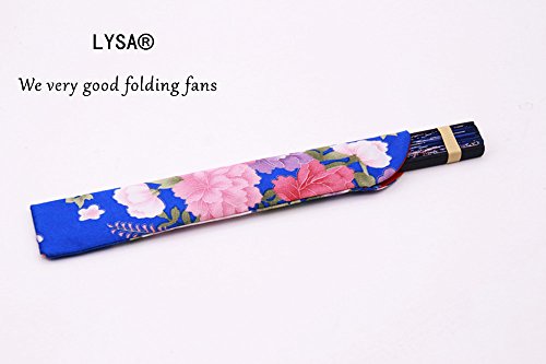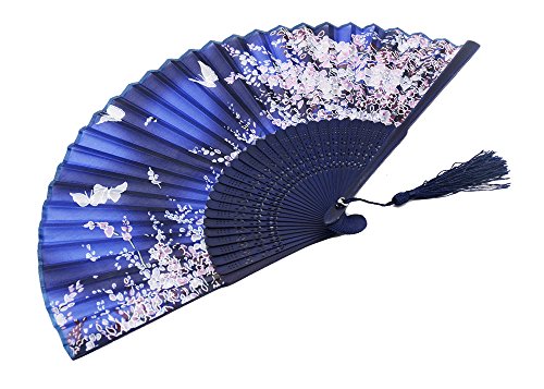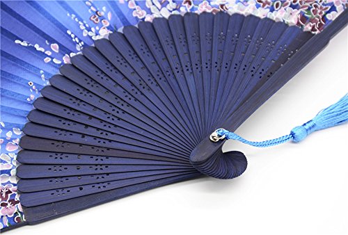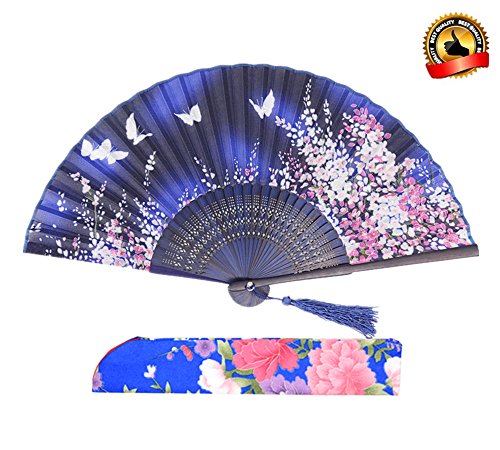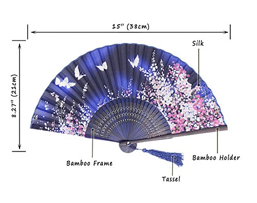 LYSA Folding Hand Held Silk Fan for Women - Silk Tissue Protective Sleeve --- Chinese/Japanese Style of “Sakura Butterfly Love” Pattern "8.27"(21cm) (Blue-007)
