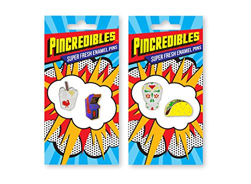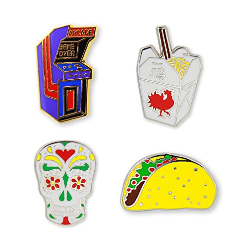 Binding : Apparel Product Description Decorate your life in colorful pins! Pincredibles collaborated with some of the hottest up-and-coming artists, street artists, graphic artists and fashion designers around the world to create our collection of super fresh enamel pins. These lapel pins add style to any jacket, bag, hat, backpack, lapel, computer bag, fanny pack, purse and more. Bright, bold enamel colors make a statement. Fasten each button with the butterfly clutch pin back affixed to the back. Collect them all, share them with your friends, and trade these tiny works of art! Pin 4-pack includes Chinese Take-out Box, Arcade Game, Taco, Sugar Skull. 0