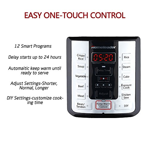 road of experiencing a better, faster, and healthier way of cooking. It seals in steam to cook hotter and faster, sealing nutrients in the food. Enjoy using pressure cooker with its DIY functions to make the best food ever. Try another kind of lifestyle by CLICKING the ADD TO CART button NOW, and Homeleader provides you with the best option.