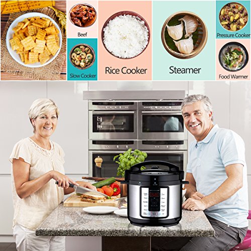 The Electric Pressure Cooker have a multi-functional nature, meeting your every cooking need. Time pre-setting and time selection functions make it super convenient for your cooking. Just pre-set the cooking time before sleeping, then you can get warm