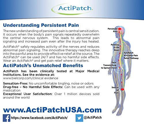 Studio : BioElectronics Corporation Publisher : BioElectronics Corporation Binding : Health and Beauty Product Description ActiPatch is a pulsed shortwave therapy(PSWT) device which emits a signal from its antenna that will reduce pain and inflammation in the body. This technology has been is clinically proven and FDA cleared for sale in the US. Unlike a TENS device, ActiPatch is completely sensation free and can be worn continuously. 0