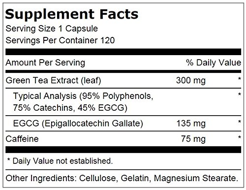 -. Feature : Superior-quality, concentrated green tea extract brimming with antioxidants (95% polyphenols, 75% catechins, 45% EGCG) / Two capsules a day provides the same amount of EGCG and caffeine used in two clinical studies for weight management / For best results, always combine with a healthy diet and exercise program / Guaranteed Potency and Purity / 120 Servings per container