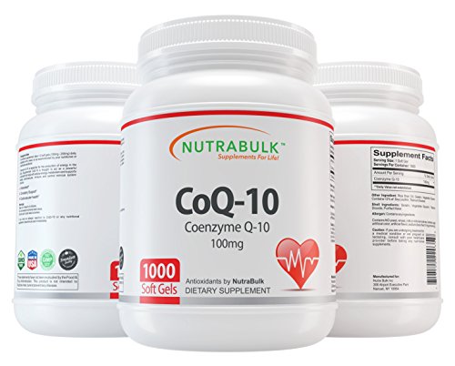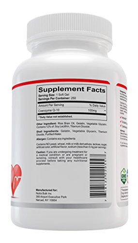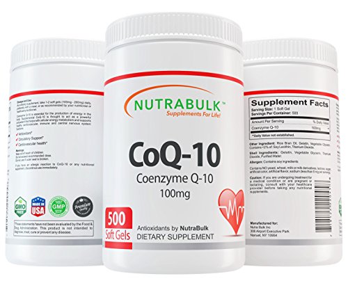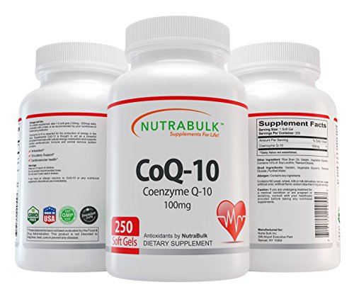 NutraBulk CoQ10 100mg Soft Gels 250 Count Bottle Coenzyme Q10 (also known as ubiquinone or ubidecarenone) is a vitamin-like substance present in most human cells, with the exception of red blood cells and eye lens cells, and is a key factor required for the production of energy by the body. In each human cell, food energy is converted into energy in the mitochondria with the aid of CoQ-10. Ninety-five percent of all the human body?s energy requirements (ATP) is converted with the aid of CoQ-10. Organs and muscles with the highest energy requirements?such as the heart and the liver?have the highest CoQ-10 concentrations. Supplemental CoQ-10 is thought to act as a powerful antioxidant that helps with cellular energy metabolism and supports healthy cardiovascular, immune and central nervous system functions. It is thought that the sick and elderly may especially benefit by boosting cellular CoQ-10 levels with supplemental CoQ-10 administration. NutraBulk?s CoQ-10 is soft gel formulated for maximum absorption by the body. They are white in color. Dosage and Use: As a dietary supplement, take one (1) soft gel daily, preferably with a meal or as directed by your health care provider. These statements have not been evaluated by the Food & Drug Administration. This product is not intended to diagnose, treat, cure or prevent any disease.Feature