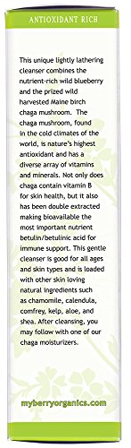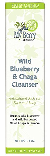 This unique cleanser combines the nutrient-rich wild blueberry and the prized wild harvested Maine chaga mushroom. The birch chaga mushroom is nature's highest antioxidant and is rich in a diverse array of vitamins and minerals. Not only does chaga contain vitamin B, but it also has been double extracted making bioavailable the most important nutrient betulin/betulinic acid that cultivated chaga does not contain. This gentle cleanser is loaded with other skin loving nature sourced ingredients such as chamomile, calendula, comfrey, kelp, aloe, and shea. After cleansing,you may follow with one of our chaga moisturizers. Read our personal story on the web at My Berry Organics.Feature