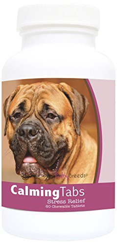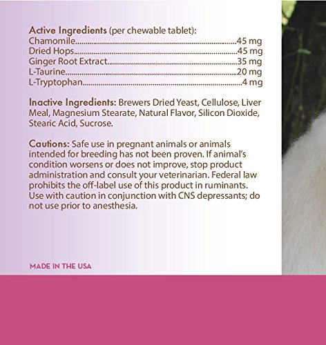 Many pets are affected by factors such as separation from their owners, veterinary visits, training and professional competition, travel and even loud noises or thunderstorms. The natural ingredients in Healthy Breeds Calming Tabs can help. Just like humans, dogs experience aniexty. Whether they are in new surroundings, separated from love ones or loud noises like fireworks. Your dog may bark, scratch, urinate, shake, or show aggressive behavior. Our calming tabs are formulated to relieve the aniexty feelings and let your dog behave more normally. Dogs love the taste of these tabs. Active Ingredients (per chewable tablet): Chamomile45 mg Dried Hops45 mg Ginger Root Extract35 mg L-Taurine20 mg L-Tryptophan4 mg. Directions for Use: