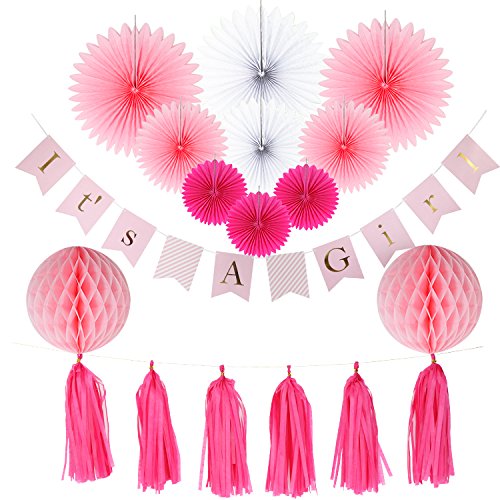 Baby Shower Decorations for Girl, It’s A Girl, Banner, Tissue Paper, Fans, Honeycomb Paper Balls, Tassels, Pink, 13pcs., Gold Foil, Hanging ,Party Supplies...