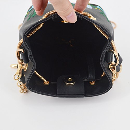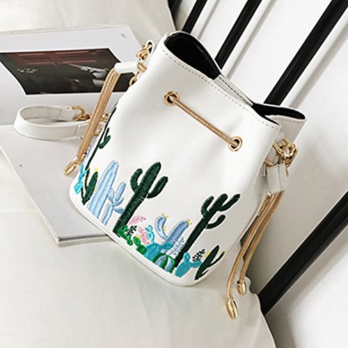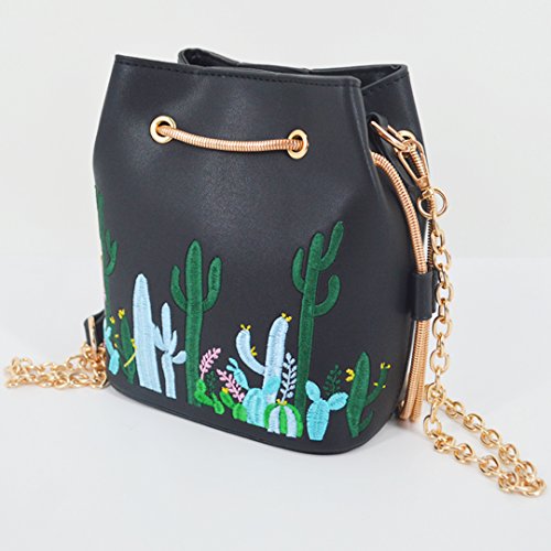 -. Feature : Leather Buckets purse cactus embroidery chain bag / Material: quality PU leather, smooth to touch; Unlined; Heavy-duty gold hardware, durable and lasting / Drawstring closure with one nagnetic snap button in the middle, the strap is adjustable (to a point), meaning you can lengthen it or shorten it slightly more as you desired. / Dimension: width 6.3in, height 7.1in; mini bucket bag for cell phone, sunglass, compact and other small essentials, please note the size before order / Chain leather shoulder strap, refreshing cactus embroidery, very cute and unque, perfect for dating, quick get out, concert, music fetival, etc.