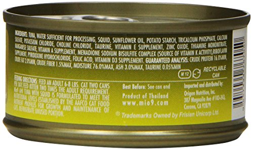 100% Ahi Tuna Flakes In Broth. Tuna is a great source of: Proteins, Fatty Acids and Omega 3. Feeding Instructions: Feed an adult (6-8 lbs. cat ) cat two cans per day. Feed kittens two times the adult requirement.Feature