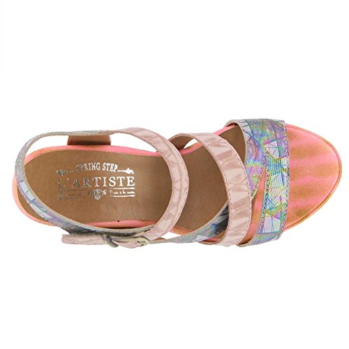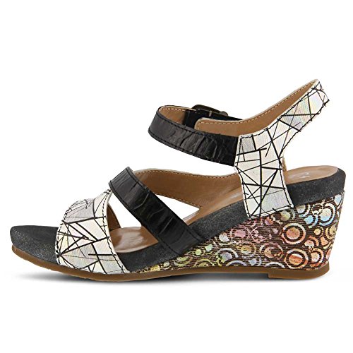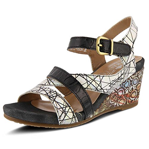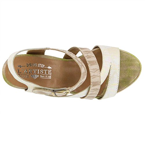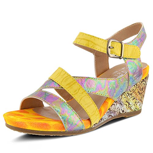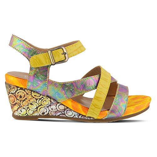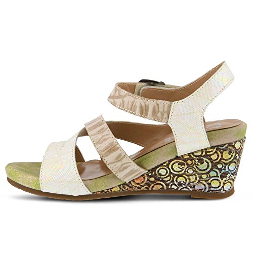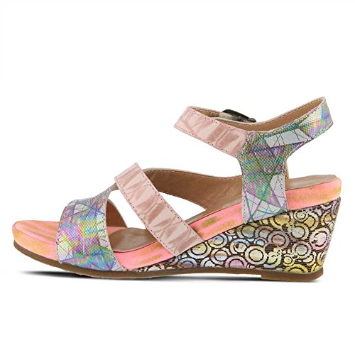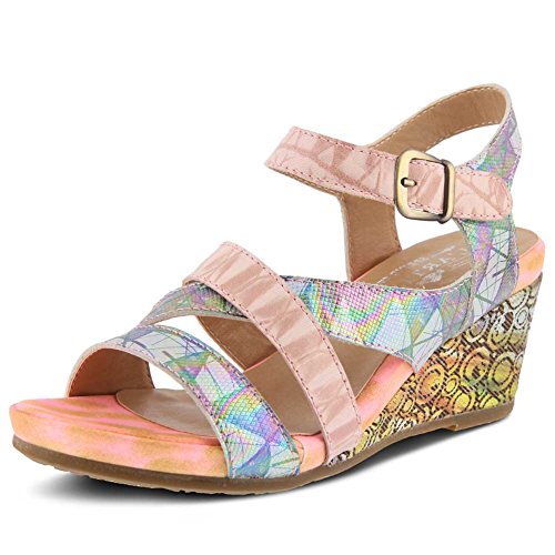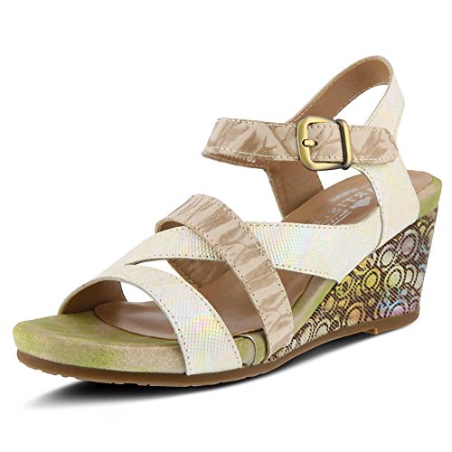 Product DescriptionFrench inspired, printed leather sandal featuring an iridescent print textile wrapped wedge.0